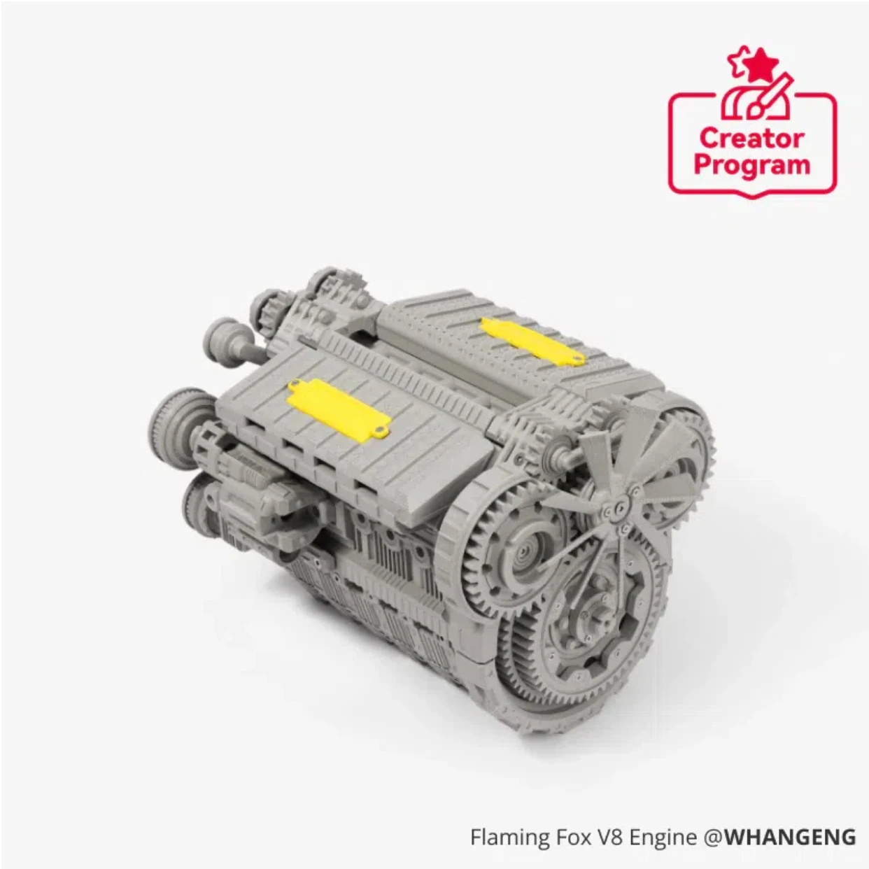 Para baixar os arquivos do modelo​ do Motor Flaming Fox V8 e obter informações detalhadas de montagem, visite a página do projeto no MakerWorld.